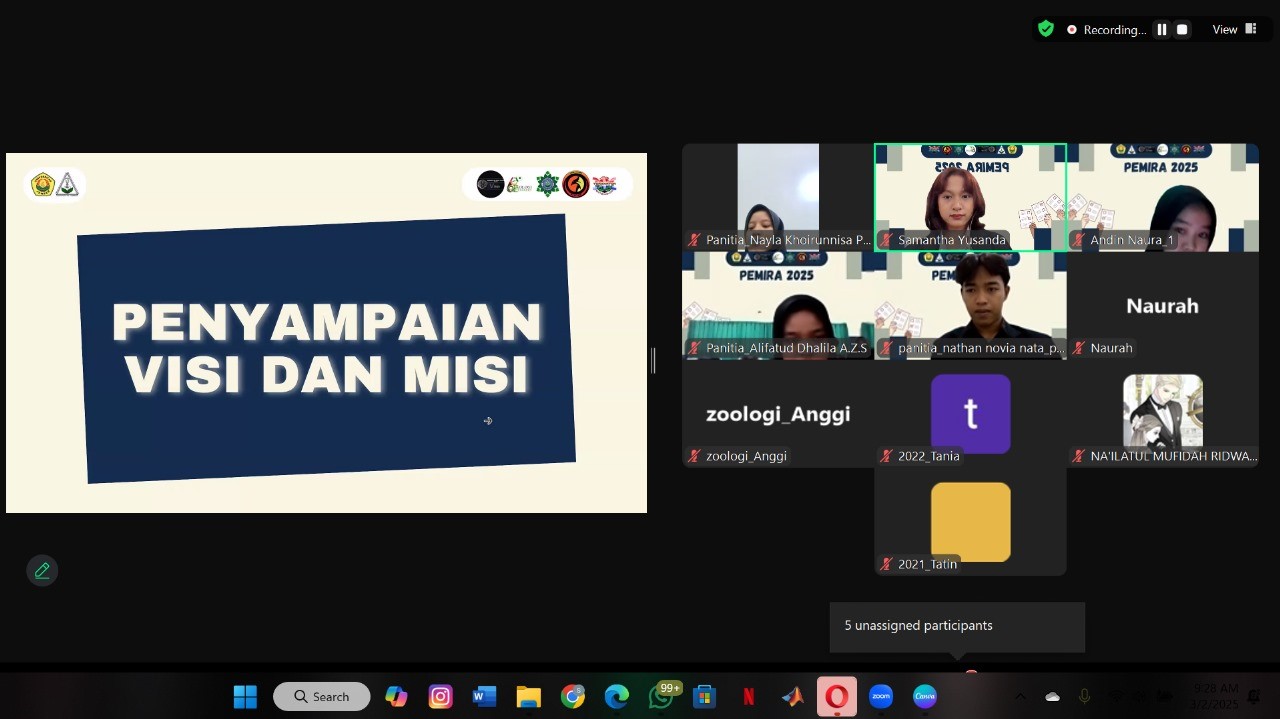 Acara Pemira (Pemilu Raya) pada tahun ini dilaksanakan pada tanggal 2 Maret 2025 yang berlangsung secara online di ruang kuliah umum. Pelaksanaan Pemira 2025 diawali dengan kegiatan gladi bersih yang melibatkan seluruh panitia penyelenggara untuk memastikan seluruh rangkaian kegiatan terkoordinasi dengan baik, serta seluruh panitia memahami peran dan tanggung jawabnya selama kegiatan berlangsung. Peserta diarahkan untuk memasuki ruang Zoom utama yang telah disiapkan oleh panitia setelah gladi bersih dilakukan. Acara kemudian dibuka oleh MC melalui serangkaian pembukaan serta sambutan dari beberapa pihak, seperti Ketua Panitia Pemira 2025, Ketua Umum Himpunan Mahasiswa Biologi, Pembina Himabio, dan Ketua Jurusan Biologi FMIPA Universitas Jember. Acara kemudian dilanjutkan dengan peserta memasuki breakout room sesuai Kombi masing-masing dimana calon-calon Ketua Kombi diberikan kesempatan untuk memperkenalkan diri, memaparkan visi, misi, serta program kerja yang akan mereka jalankan jika terpilih. Peserta dapat mengajukan pertanyaan setelah pemaparan selesai sesuai arahan dari moderator. Acara selanjutnaya adalah pemungutan suara yang akan dilakukan melalui google form yang telah disiapkan dan dipandu oleh panitia yang bertugas. Sebagai penutup, panitia mengumumkan hasil pemungutan suara secara langsung di masing-masing breakout room, dan menetapkan Ketua Kombi terpilih periode 2025 untuk setiap Kombi.