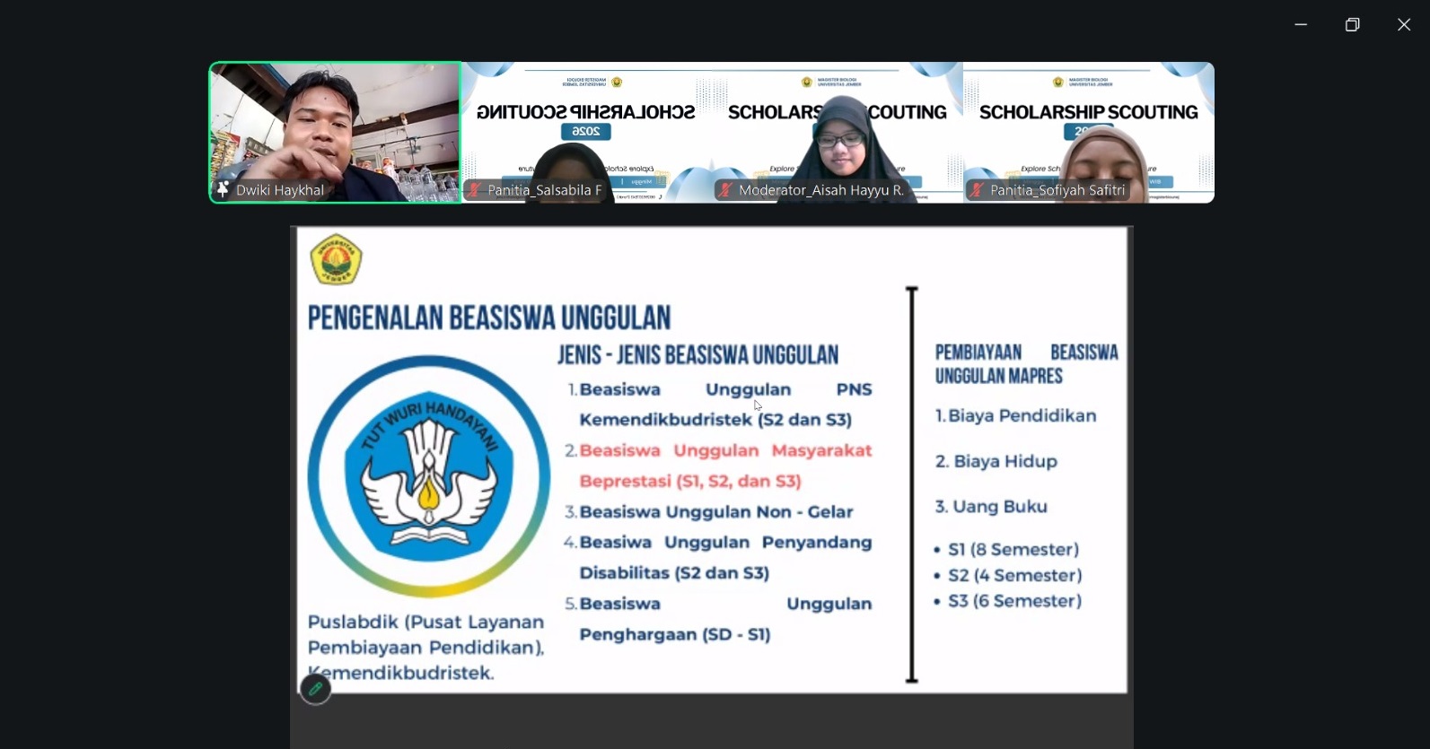 Program Studi Magister Biologi, Fakultas MIPA Universitas Jember, menyelenggarakan kegiatan bertajuk “Global Scholarship Scouting” sebagai upaya memberikan wawasan dan motivasi kepada mahasiswa terkait peluang studi lanjut melalui berbagai program beasiswa nasional dan internasional. Kegiatan ini berlangsung dalam bentuk webinar pada hari Minggu 29 Maret 2026 melalui platform Zoom dan oleh lebih dari 200 peserta mahasiswa maupun umum yang antusias ingin menggali informasi mengenai beasiswa unggulan dan doktoral.